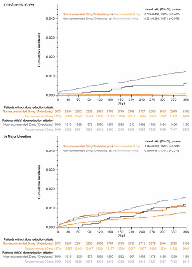 The term “recommended” dosing here used refers to the receipt of an edoxaban dose that is in accordance with the local edoxaban label (60 mg QD in patients who do not meet any of the aforementioned dose reduction criteria and 30 mg QD in patients who meet at least one of the criteria for reduction); conversely, the term “non-recommended” dosing refers to the receipt of an edoxaban dose that is not aligned with the local edoxaban label. The terms “underdosing/underdosed” and “overdosing/overdosed” are utilized herein for simplification and to align with terminology from other publications and, for this reason, are put in quotation marks; these terms do not imply that patients received an insufficient dose or a drug overexposure, respectively, which might translate to an unfavorable outcome. Patients receiving edoxaban 15 mg were excluded from this analysis.