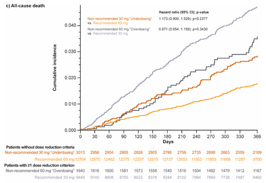 Patients receiving 60 mg were more likely to receive antiplatelet therapy than patients receiving 30 mg (recommended 60 mg vs. non-recommended 30 mg: 13.1% vs. 11.3%, p = 0.01; non-recommended 60 mg vs. recommended 30 mg: 12.7% vs. 8.0%, p < 0.0001) (Table 2). Heparin/fondaparinux was prescribed more often to recipients of recommended vs. non-recommended dosing (recommended 60 mg vs. non-recommended 30 mg: 9.0% vs. 5.8%, p < 0.0001; non-recommended 60 mg vs. recommended 30 mg: 8.8% vs. 11.3%, p = 0.01) (Table 2). The use of non-steroidal anti-inflammatory drugs (NSAIDs) and of P-gp inhibitors was low (<1.5%) for all dosing groups.