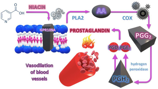 The process is significantly influenced by the hydroxycarboxylic acid receptor 2, which is coupled with the G protein and is expressed on the immune cells of the epidermis and keratinocytes. Interaction between niacin and niacin G protein-coupled receptor HM74A on epidermal cells increases the concentration of cytosolic calcium which triggers phospholipase A2 activity [31]. Thus, the hydrolysis of membrane phospholipids occurs as well as the release of AA, which is converted to prostaglandin D2 (PGD2) and prostaglandin E2 (PGE2) via cyclooxygenase-2 (COX-2). This reaction leads to the relaxation of the smooth muscle, causing the dilation of blood vessels [32,33]. Therefore, it has been postulated that the decreased skin reaction in patients with SCH may be caused by AA deficiency in the cell membrane [34,35,36]. The mechanism of the niacin action on the cell membrane is presented in Figure 1.