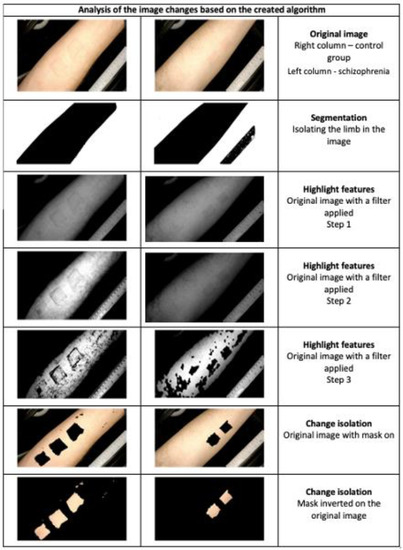 Figure 3. The analysis of photos was subjected to the created algorithm to isolate the changes occurring on the skin during NSFT using the SKINREMS device [33].
