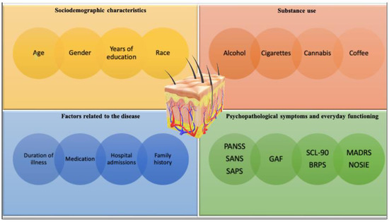 Figure 4. Studied factors that could potentially affect the results of the NSFT. *based on the articles discussed above: PANSS—The Positive and Negative Syndrome Scale, SANS—Scale for the Assessment of Negative Symptoms, SAPS—Scale for the Assessment of Positive Symptoms, GAF—Global Assessment of Functioning Scale, SCL-90—The Symptom Checklist-90, BRPS—Brief Psychiatric Rating Scale, MARS—Montgomery-Asberg Depression Rating Scale, NOSIE—Nurses’ Observation Scale for Inpatient Evaluation.