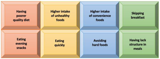 Almost 100 years ago, Burr and Burr discovered the importance of linoleic (LA) and alpha-linolenic acid (ALA) and created the term “essential fatty acids”, since they must be supplied to the organism along with the diet [80]. A substantial point of PUFA metabolism is that n-3 and n-6 PUFAs compete for the same delta-6-desaturase enzyme. Hence, the basis of their optimal transformation is the proportion in which they are delivered [81]. Industrialization resulting in dynamic changes in diet is undoubtedly a new phenomenon in the history of mankind. It has led, among other things, to an increase in the consumption of saturated fat, omega-6 fatty acids, and trans-fatty acids, decreasing omega-3 fatty acids intake. Additionally, trans-fatty acids interferes with the desaturation and elongation of omega-6 and omega-3 acids, which leads to a reduction in the availability of AA in human metabolism [82,83]. The ratio of omega-6 and omega-3 fatty acids in a Western diet, poor in omega-3, fluctuates within 15–20: 1 instead of 1:1 to 4:1 [84,85]. It has been proven that a significantly increased omega-6 to omega-3 ratio is associated with the occurrence of various chronic diseases including inflammatory bowel disease, cardiovascular disease, rheumatoid arthritis, and mental disorders [86]. Additionally, in the aspect of eating habits, there are systematic review reports on the dietary patterns of individuals suffering from psychotic disorders that are worth paying attention to [87]. Based on discussed articles some eating habits of patients are presented in Figure 5.