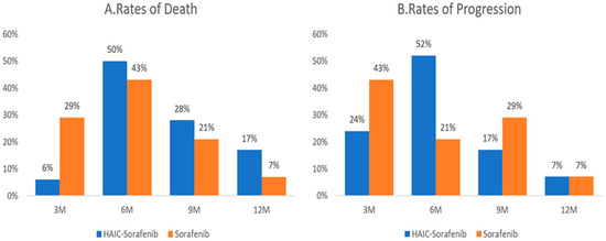 Approximately 93% of progressions and 84–93% of deaths occurred within 9 months after treatment in both groups. The maximum risk of death and progression increased at 6 months, while the risk decreased at 9 months. Compared to the sorafenib group, the combination group had a lower mortality rate (6%) and disease progression rate at 3 months (24%) as well as a lower disease progression rate at 9 months (17%) (Figure 1).