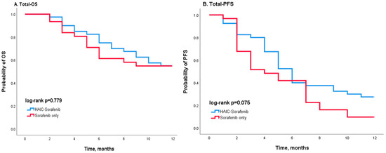 There have been several studies discussing the treatment effects of HIAC or HAIC combined with sorafenib for HCC patients [5,6,7,9,10,11,12,13,14,16,17]. Most showed promising treatment effects of HIAC, with a median OS ranging from 10.1 to 17.1 months compared to sorafenib alone and with a median OS ranging from 6.5 to 10.7 months. Moreover, in patients affected by macroscopic vascular invasion of HCC, HAIC could provide a much better OS than sorafenib alone [10,17]. In our study, patients in the combination group had a more advanced tumor status and more tumors with macrovascular invasion, and combining HAIC with sorafenib as a salvage treatment could provide an OS of approximately 12 months, which is compatible with the results in the literature.