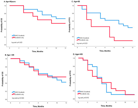 Kaplan–Meier survival analysis according to different treatments (HAIC-sorafenib versus sorafenib alone) for patients of different age groups: (A,B) OS and (C,D) PFS. Among those younger than 65 years, the survival curves show a better OS and PFS in the combination group (A,C), and the log-rank test indicates a significant difference in PFS (p = 0.023 in (C)). Among those aged 65 and older, the log-rank test shows no significant differences between the survival curves (B,D).