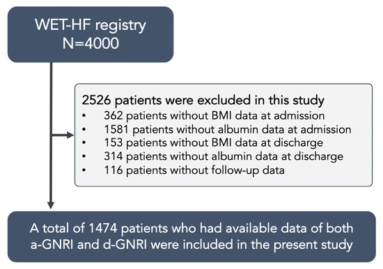 From 2006 to 2017, 4000 patients were enrolled in the WET-HF Registry. Out of those patients, 2410 patients who did not have available GNRI data and 116 patients without any follow-up data were excluded in this study. Finally, a total number of 1474 patients (median age, 76 years [IQR: 65–83]; 58.5% male) were included in the present study (Figure 1).