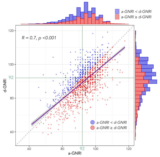 Distribution of GNRI values at hospital admission and discharge. A scatter plot between a-GNRI and d-GNRI with those histograms. Purple line with gray area indicates linear regression line with 95% CI. A blue and red dot indicate a patient with increase and decrease in GNRI during the hospitalization, respectively. While there is strong correlation (R = 0.7) between a-GNRI and d-GNRI, the majority of the patients show decrease in GNRI during the hospitalization.