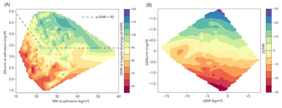 Heatmaps for d-GNRI and ∆GNRI. (A) Complementary relationship between BMI and albumin values at hospital admission in predicting the GNRI value at hospital discharge (d-GNRI). d-GNRI is color-coded from red (the lowest d-GNRI) to blue (the highest d-GNRI). The dashed line indicates a-GNRI = 92, so the area above the line indicates a-GNRI > 92, whereas the area below the line indicates a-GNRI < 92. (B) ∆GNRI from hospital admission to discharge according to the relationship between ∆BMI and ∆albumin. ∆GNRI is color-coded from red (the lowest decrease) to blue (the highest increase). Because of the formula of GNRI, GNRI completely depends on serum albumin if the patient’s BMI exceeds 22 kg/m2 (“body weight/ideal body weight” must be set to 1), and changes in GNRI during hospitalization also depend mainly on albumin rather than BMI.