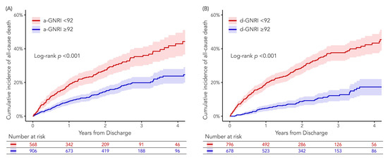 Kaplan–Meier curves for long-term all-cause death according to (A) a-GNRI or (B) d-GNRI. The red and blue area indicate 95% CIs of the corresponding Kaplan–Meier curves. When stratified by a-GNRI or d-GNRI with the cutoff value of 92, a-GNRI < 92 and d-GNRI < 92 groups had a significantly higher all-cause mortality risk up to 4 years than a-GNRI ≥ 92 and d-GNRI ≥ 92 groups, respectively.