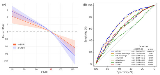Figure 5 shows the predictive ability of a-GNRI or d-GNRI in terms of risk of all-cause death. The restricted cubic spline curves (Figure 5A) suggest that d-GNRI had a stronger association with the risk of all-cause death both below and over 92 compared to a-GNRI, where higher d-GNRI was more associated with survival than higher a-GNRI, and lower d-GNRI was more associated with death than lower a-GNRI. When comparing the ROC curves of several variables, including a-GNRI, d-GNRI, ∆GNRI, BMI at discharge, ∆BMI, albumin at discharge, and ∆albumin, d-GNRI had the best AUC among those variables, although albumin at discharge also had a high prognostic value close to that of d-GNRI, and there was no statistically significant difference between these two variables by DeLong’s test (p = 0.140, Figure 5B). Compared to a-GNRI, d-GNRI had a significantly higher prognostic value for all-cause mortality (p < 0.001).