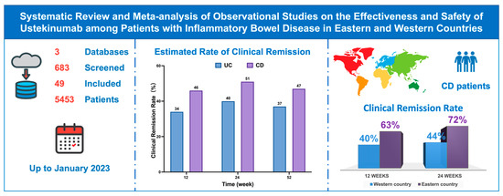 Zhou, H.; Wang, F.; Wan, J.; Su, S.; Shi, Y.; Li, X.; Wu, T.; Liang, J. Systematic Review and Meta-Analysis of Observational Studies on the Effectiveness and Safety of Ustekinumab among Patients with Inflammatory Bowel Disease in Eastern and Western Countries. J. Clin. Med. 2023, 12, 1894. https://doi.org/10.3390/jcm12051894
