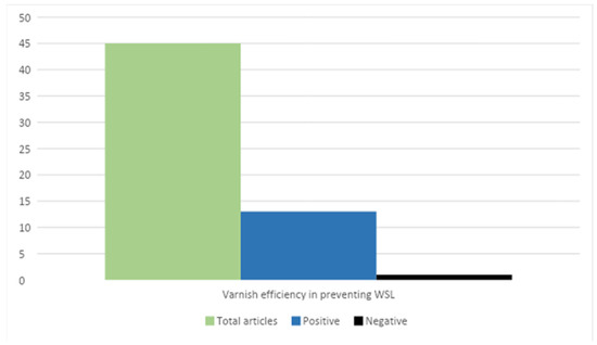 Using only standard prophylaxis, the treatment of demineralization around brackets has progressed. Additional prophylactic measures such as fluoride varnishes are needed. Among the analyzed studies that address the use of fluorinated varnishes and gels in the office for the prevention of WSLs and even the treatment of incipient lesions, 14 of the studies demonstrated the effectiveness of varnishes for this purpose (Figure 3).
