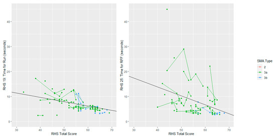 The average time for Item 19 (runs 10 m) when achieving a RHS total score of 50 was 7.91 s, and for every increase of one-point in RHS total score, this time reduced by 0.17 s. The average time for item 25 (rise from floor) when achieving a RHS total score of 50 was 10.18 s, and for every increase of one-point in RHS total score, this time reduced by 0.36 s. When comparing trends of RHS total score with the two timed test items, we see that for participants achieving above a 60 on the RHS total, there is about 5 s of variation in the time for run and nearly 20 s in variation in the rise from floor time. The rise from floor time is noticeably more variable than the time for run, as can be seen in Figure 1. This suggests that higher granularity can be achieved by looking at the rise from floor. Additionally, the rise from floor shows more of a person-specific effect, where some participants have higher rise-from-floor times across all time-points. This may suggest that the rise from floor captures aspects of strength and function that are at least partially independent of the RHS total score. A possible contributor to these differences might also be related to the lower limb contractures, muscle imbalances, and the different distribution of muscle weakness that can impact strategy selection and be observed between participants apparently performing at a similar level when assessed with a functional scale.