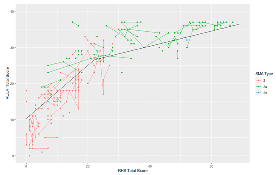 One limitation of this study is that by splitting the participants into age groups, and not considering instead age as a continuous variable, it is possible that the groups chosen do not fully represent the participants. The groups here are nevertheless similar to groups used in papers analysing the HFMSE and reflect the peak in motor function observed at 5 years in the SMA 2s, and at 7 years in the SMA 3s [24]. In order to allow analysis of the change scores by motor function category and baseline RHS, the groups that have previously been used (i.e., <5, 5–13, >13 for SMA 2s age [20,23,26,27]; and <5, 5–7, 8–14, >14 for SMA 3s [23,28]) were merged to create the following groups: <5, 5–7, 7–13, 14–18. In this analysis, only children were included, but it will be important to separately analyse the natural history of the RHS in adult SMA in the future [23]. Finally, as this population was selected from the full collected cohort based on completeness of the full RHS, with non-missing items, we cannot exclude that the participants included in this analysis will be biased towards a stronger population, as it might be that some participants having missing items because they were not able to complete the items were excluded from the analysis. The inclusion of missingness codes for each item in future prospective data collections, with options such as “not completed due to injury” vs. “not completed due to lack of time”, could address this limitation.