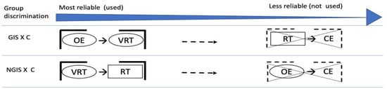 For the GIS group, there were two significant discriminant dimensions [χ2 (2) = 53.4, p < 0.001]. The pooled within-group correlations identified large correlations with the discriminant model: OE and VRT. Therefore, OE and VRT discriminated GIS patients from controls, and the subjects were correctly classified with 90.7 % accuracy. When VRT and RT were replaced by CV, we still found two significant dimensions for the GIS group [χ2 (2) = 50.01, p < 0.001]. The pooled within-group correlations identified that CV and OE were capable of discriminating the control group from the GIS group with 90.7% accuracy. The results based on the discriminant analyses are summarized in Figure 2.