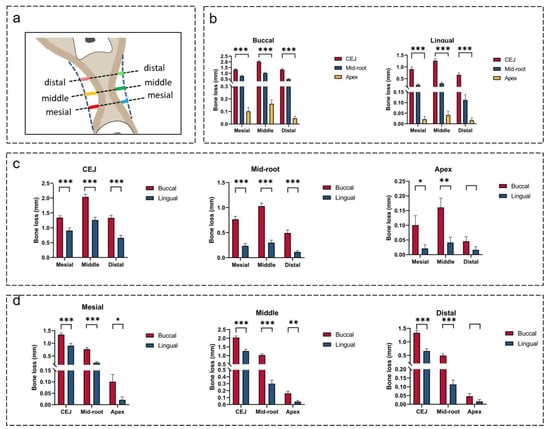 (a) Illustration showing horizontal alveolar bone loss. (b) Comparisons of horizontal bone loss at different sites. (c) Comparisons of buccal and lingual bone loss at mesial, middle, and distal sites. (d) Comparisons of buccal and lingual bone loss at CEJ, mid-root, and apex levels. * indicates p < 0.05, ** indicates p < 0.01, *** indicates p < 0.001.