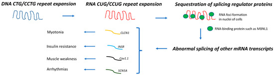 Pathogenic mechanism in DM. DNA repeat expansions are transcribed into mRNA molecules that accumulate in nuclei of cells and sequester splicing regulator proteins, such as MBNL1. As a result, abnormal splicing of a subset of other mRNA occurs, leading to different disease manifestations [6,7,8,9,10].