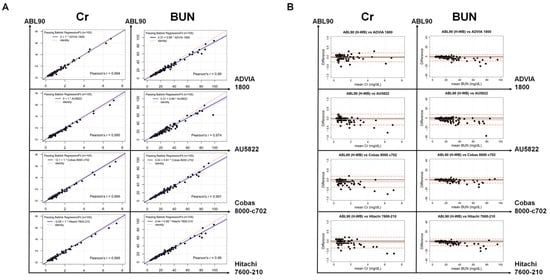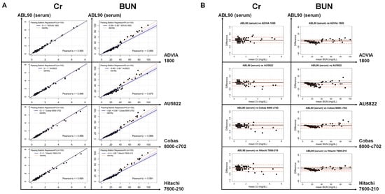 | (A) Cr and BUN Results according to Analyzers | ||||||