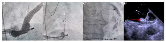 Steps of the procedure. Panel (A) VOM (white arrow) in Coronary sinus venogram. Panel (B) Vein of Marshall venogram was performed after the balloon was inflated to reveal the anatomy of the VOM (white arrow). Panel (C) Contrast infiltration (black arrow). Panel (D) Watchman closure implantation. Prominent edema of the coumadin ridge (red arrow) in the echocardiographic image. VOM, vein of Marshall.