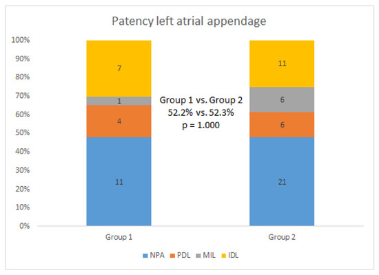 After a median of 68 (IQR: 59, 89) days, 25 patients (96.2%) in group 1 and 69 patients (93.2%) in group 2 received their first radiographic examinations (Table 3). A total of 66 patients (70.2%) received a CCTA examination. More patients in group 1 chose CCTA as their follow-up examination (88.5% vs. 58.1%, p = 0.005). Follow-up results were comparable between the two groups: DRT or suspicious DRT was not found in the follow-up cohort; seven (28.0%) and 23 (33.3%) patients had PDLs in groups 1 and 2, respectively (p = 0.803); two patients (8.0%) in group 1 and 11 patients (15.9%) in group 2 had < 3 mm PDLs (p = 0.502); four patients (16.0%) in group 1 and 11 patients (15.9%) in group 2 had 3–5 mm PDLs (p = 1.000); and 24 patients (96.0%) in group 1 and 68 patients (98.6%) in group 2 achieved adequate occlusion (p = 0.463). The LAA patency in patients who received CCTA follow-up was also evaluated (Figure 3). A total of 31 patients (52.2%) had patency LAA, with 11 patients (51.3%) in group 1 and 21 patients (52.3%) in group 2 (Fisher exact test, p = 1.000).