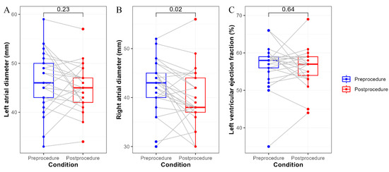 Cardiac function pre- and post-ethanol infusion. Panel (A) Changes in the left atrial diameter; Panel (B) Changes in the right atrial diameter; Panel (C) Changes in the left ventricular ejection fraction. Variables were compared using the paired t-test.