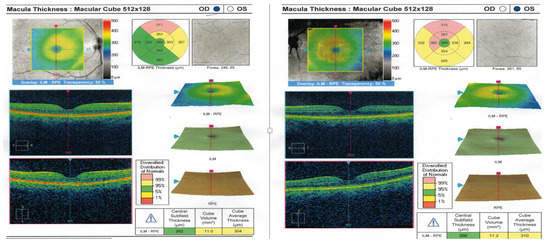 Thickening of the central part of the macula demonstrated in macular OCT, mainly in the left eye.