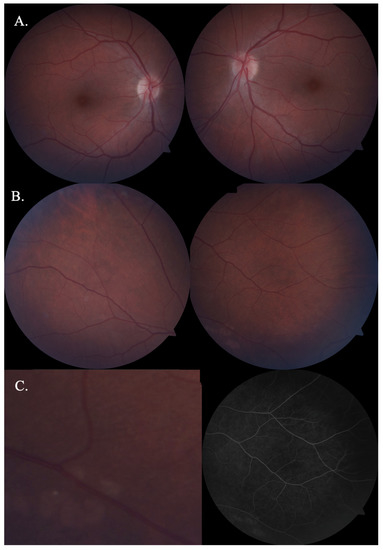 Eye fundus fluorescein angiography of the patient with CADASIL. (A) Constricted retinal arteries in both eyes. (B) Retinal pigment epithelium (RPE) atrophy in both eyes, but mainly in the left eye. (C) Retinal pigment epithelium (RPE) atrophy with focal drusen in the left eye.