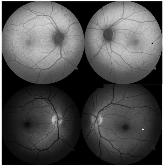 Fluorescein angiography of the right and the left eye. Discrete retinal lesions in the left eye (the arrow demonstrates focal drusen).