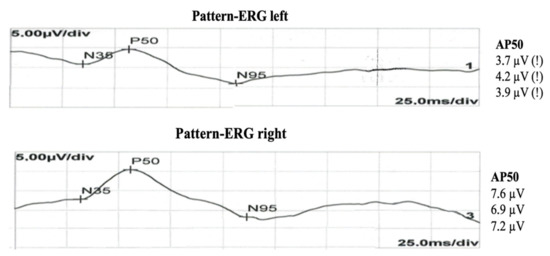 Another interesting observation concerns the early changes in functional retinal ganglion cells and retinal photoreceptors, which were confirmed in the pattern electroretinogram (PERG) and revealed a reduced P50 wave amplitude in the patient’s left eye (Figure 6). A similar phenomenon has been described as cholinergic deficiency in the pathogenesis of Alzheimer’s disease (AD); therefore, it is possible that it is related to dementia changes [19]. The PERG revealed a retinal bioelectric dysfunction in the form of reduced P50 wave amplitude in the patient’s left eye, which was also confirmed in our patient. These changes may indicate possible ischemic impairment of ganglion cells and their axons as a result of retinal photoreceptor dysfunction, as documented in our CDI study with concomitant changes in macular OCT [20].