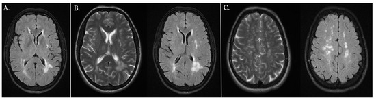 MRI of the central nervous system. (A) Single focal subcortical microinfarct in the left external capsule shown in MRI-FLAIR image. (B) Subcortical and periventricular areas of the white matter of the brain shown using MRI, along with multiple focal vasogenic lesions in the white matter of both hemispheres, partly merged in the occipital horn region (LS: MRI-T2 image, RS: MRI-FLAIR image). (C) The formation of pathological changes mainly in the white matter of the brain shown in MRI (left side (LS): MRI-T2 image, right side (RS) MRI-FLAIR image).