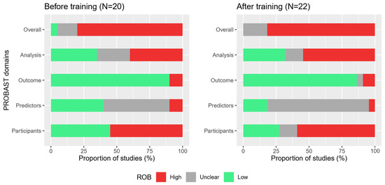 The PROBAST assessment of the forty-two studies [31,32,33,34,35,36,37,38,39,40,41,42,43,44,45,46,47,48,49,50,51,52,53,54,55,56,57,58,59,60,61,62,63,64,65,66,67,68,69,70,71,72] resulted in a low overall ROB rating for only one study (2%), while seven studies (17%) received an unclear ROB rating and thirty-four studies (81%) a high ROB rating [24]. The domain “outcome” contributed the highest proportion (n = 37; 88%) of low ROB ratings among all four domains in our investigation. The set of studies before and after training was similar regarding the overall ROB rating. Figure 2 shows the distribution of the overall and domain-specific ROB ratings in the two sets of studies assessed before and after the training. Details of the individual ROB rating results can be found in the Supplementary Table S1.