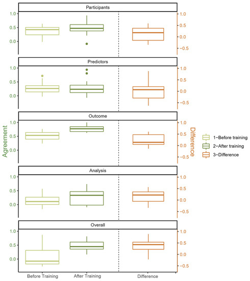 The distribution of AC1 estimates for pairwise agreement before and after training for the domain-specific and overall ROB ratings is shown in the left panel of Figure 4. In addition, the distribution of ∆AC1 estimates of pairwise agreement is presented in the right panel of the same figure. The detailed values of all estimates of pairwise agreements can be found in Tables S2–S6 in the supplement. The highest level of agreement, both before and after training, can be found in the domain “outcome”. The median of the differences was greater than 0 for all domains, indicating a positive effect of the training. For the overall ROB rating, the median of ∆AC1 was highest (0.427).