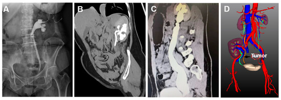 Images of patients. (A): Patient 1, KUB figure shows distal ureteral stricture and dilation of renal pelvis and ureter; a nephrostomy tube was implanted; (B): patient 12, multidimensional reconstruction CT image shows duplicate kidney and ureter; the ureter shows Y-shaped duplication; (C): patient 13, reconstructed CT image shows full-length dilation of the renal pelvis and ureter, as well as distal ureteral stricture; (D): patient 14 underwent renal transplantation and has a secondary tumor of the native ureter. CT three-dimensional reconstruction image shows that the native ureter is closely adjacent to the renal artery of the transplanted kidney.