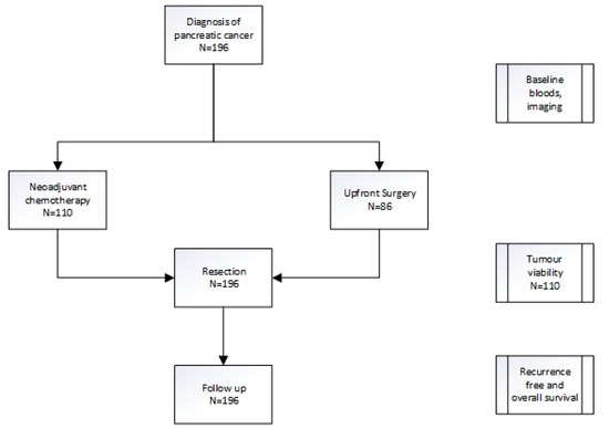 Blood tests were taken at the time of staging laparoscopy and prior to chemotherapy in patients that received neoadjuvant chemotherapy (NAC). Baseline resectability and stage were determined via a computerised tomography (CT) scan. Upfront treatment with either NAC or upfront surgery was recorded (Figure 1, Table 1).