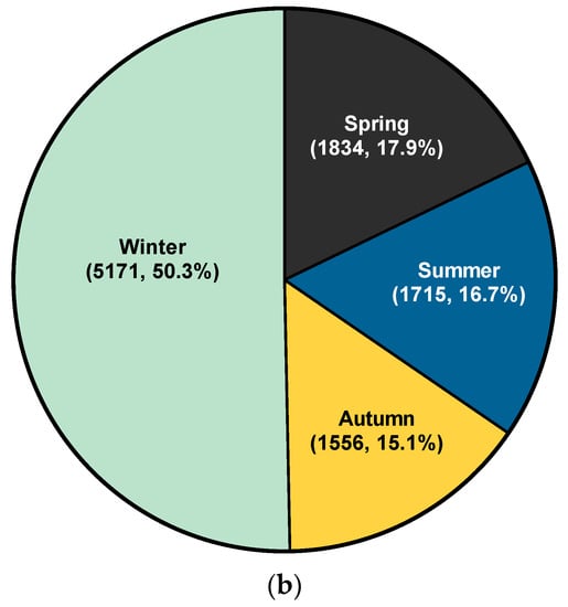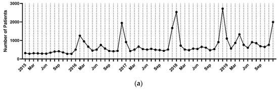 Of the 42,775 patients of all ages, 3865 were diagnosed in 2015, 8883 in 2016, 7702 in 2017, 11,239 in 2018, and 11,086 in 2019 (Table 3). In 2015, the incidence rate was highest in September, and in 2016–2019, it was highest in December (Figure 1a). Overall, the cumulative number of cases per month over the 5-year study period was highest in December and lowest in October. The average number of cases per month was 540, and the average number of cases per year between 2015 and 2019 was 71,341. Additionally, encephalitis was most often diagnosed during winter (50.3%), followed by spring (17.8%), summer (16.7%), and autumn (15.1%) (Figure 1b).
