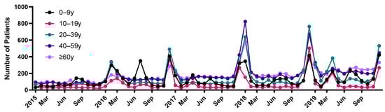 In addition, the seasonal trends in the incidence rate were similar in all age groups, increasing in the winter (Figure 2).