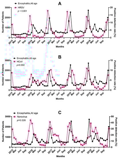 Among the seven respiratory viruses and four gastrointestinal viruses considered, the prevalence of certain viruses increased 1 month before the encephalitis incidence increased. The PDRs for HRSV (p < 0.001) and HCoV (p = 0.002) were associated with an increased incidence of encephalitis 1 month later in all age groups (Figure 3A,B). The PDR for norovirus (p = 0.026) was associated with an increased incidence of encephalitis 1 month later in patients aged 20 years and over (Figure 3C); the PDR for IFV (p = 0.041) was associated with an increased incidence of encephalitis 1 month later in patients aged 60 years and over.