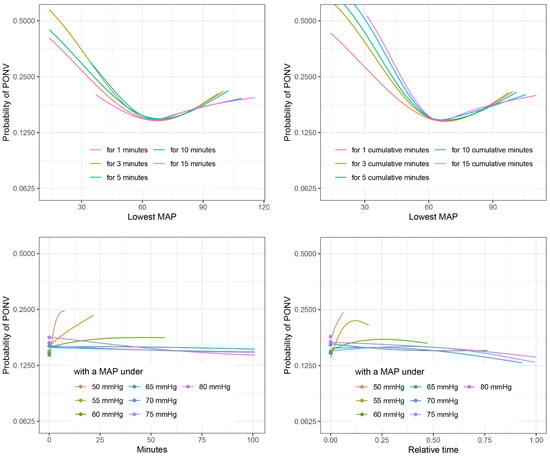 Due to incomplete preoperative vital signs, it was not possible to use characterizations applying a decrease from preoperative baseline. However, the current literature suggests that relative changes of blood pressure may be comparably or even less relevant than absolute MAP limits regarding patient outcome [,]. As Figure 1 shows, most characterizations analyzed in the present study showed an increased risk of PONV below 60 mmHg, independently of being based on time below a certain MAP or sustained MAP for a certain time.