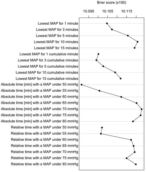 Systematic comparison of characterizations in terms of the cross-validated Brier score achieved by the multivariable model showed that the characterization “time with a MAP < 50 mmHg” had the strongest association with PONV, followed by “lowest MAP for 3 cumulative minutes” and “lowest MAP for 1 cumulative minute” (Figure 2).