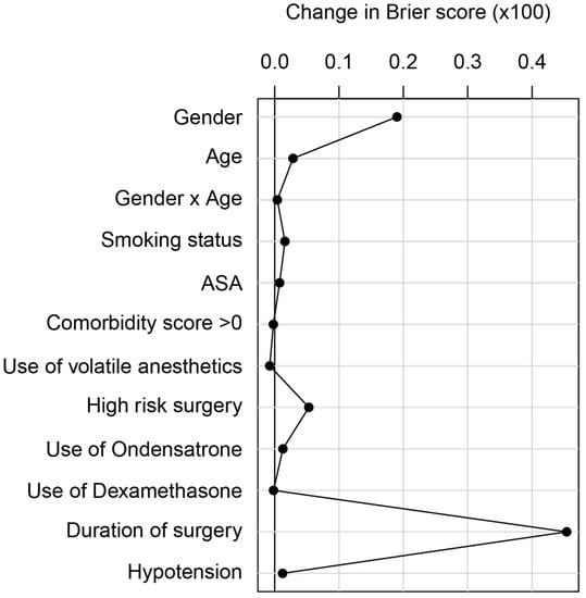 Analysis of the influence of the different adjusting variables showed that in the multivariable model the duration of surgery made the most significant contribution in terms of change in cross-validated Brier score (0.005), followed by sex and age (Figure 3).