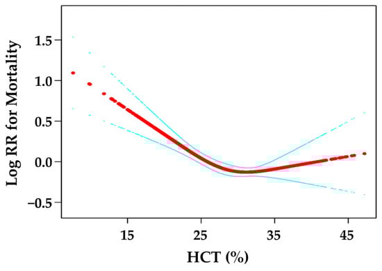 Curve fitting between HCT and mortality. The red line is the fitting curve, and the blue lines are 95% CI.