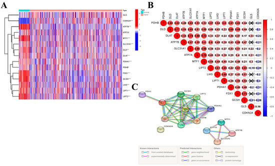 Expression of the cuproptosis-related genes in thyroid carcinoma (THCA). (A) The heatmap showed the expression levels of 15 cuproptosis-related genes in normal and tumor samples. * if p < 0.05, and *** if p < 0.001. (B) Pearson correlation analysis of the 15 cuproptosis-related genes in THCA. (C) PPI network indicated the interactions of the cuproptosis-related genes.