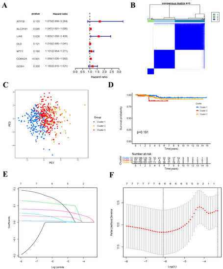 Univariate Cox regression analysis, identification of consensus clusters based on the cuproptosis-related genes and LASSO analysis. (A) Forest plot showing the result of univariate Cox regression analysis of OS, seven genes with p < 0.2. (B) Consensus clustering matrix for k = 3. (C) Principal Component Analysis (PCA) of the RNA expression profile in TCGA cohort. (D) Kaplan–Meier curves of overall survival (OS) in three clusters. (E) Cross-validation for tuning parameter selection in the LASSO regression. (F) LASSO analysis of seven prognostic cuproptosis-related genes.