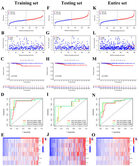Furthermore, the predictive performance of the risk signature was further verified in the testing set and the entire set. The risk scores of each patient were calculated and the patients were classified into low- and high-risk groups in the two sets based on our risk signature. The distribution of the risk score and survival status in the testing set were shown in Figure 3F,G. Kaplan–Meier survival curves also showed that the OS of high-risk patients was lower than that of the low-risk group in the testing set (p = 0.028) (Figure 3H). The AUCs were 0.772, 0.760, and 0.847 for 5 years OS, 8 years OS, and 10 years OS, respectively (Figure 3I). The expression patterns of six CRGs were shown in Figure 3J. The results in the entire set were consistent with those in the training set and testing set. The distribution of risk scores and patients’ survival status are also presented in Figure 3K,L. The OS in the high-risk group was also significantly lower than that in the low-risk groups (p = 0.002) (Figure 3M). The AUC values were 0.845, 0.885, and 0.898 for 5 years OS, 8 years OS, and 10 years, respectively (Figure 3N). The expression heatmap of six prognostic genes is displayed in Figure 3O.