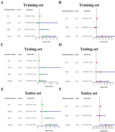 Univariate and multivariate Cox regression analyses were performed to investigate the available variables on OS of THCA patients and confirmed that the risk score was an independent prognostic predictor for OS in the training set (Figure 4A,B; univariate: HR = 3.148, 95% CI = 1.786–5.549, p < 0.001; multivariate: HR = 2.789, 95% CI = 1.146–6.786, p = 0.024). These two analyses were also carried out in the testing set and the entire set, obtaining the same conclusion as the training set. The HR values of the univariate analysis and multivariate analysis were 2.743 (CI =1.284–5.860, p = 0.009) and 2.359 (CI =1.047–5.318, p = 0.038) in the testing set (Figure 4C,D). Similarly, The HR values of these analyses were 2.927 (CI =1.898–4.513, p < 0.001) and 2.012 (CI =1.196–3.387, p = 0.008) in the entire set (Figure 4E,F).
