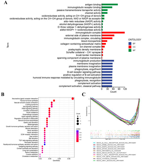 Functional enrichment analysis based on the DEGs. (A) Barplot graph for GO enrichment. (B) Bubble graph for KEGG pathways. (C) Gene set enrichment analysis (GSEA) showed the significantly enriched hallmarks of tumor sets based on the risk signature in TCGA.