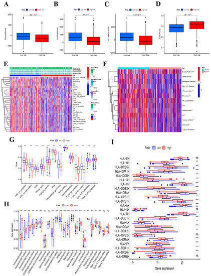 Comparison of the ssGSEA scores in the low− and high−risk groups. * p < 0.05; ** p < 0.01; *** p < 0.001; and ns not significant. (A) Stromal scores, (B) immune stores, (C) ESTIMATE scores, (D) tumor purity between low− and high−risk groups. (E) The immune status between low− and high−risk groups, (F,G) 13 immune−related functions, (H) abundance of 23 infiltrating immune cell types, and (I) the expression of HLA−related genes between high− and low−risk groups.