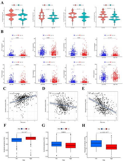 Targeted drug therapy is also a treatment method for iodine refractory thyroid cancer and advanced thyroid [21]. The sensitivity of THCA patients in the TCGA cohort to targeted drugs was predicted by “pRRophetic”. Fortunately, we identified potentially effective targeted drugs in both low-risk and high-risk groups. We found that the half-maximal inhibitory concentration (IC50) of sorafenib was lower in the low-risk group, indicating that the patients in the low-risk group were more sensitive to sorafenib (Figure 7C,F). In contrast, the IC50 of sunitinib and pazopanib was lower in the high-risk group, illustrating that the patients in the high-risk group were more sensitive to these two drugs (Figure 7D,E,G,H).