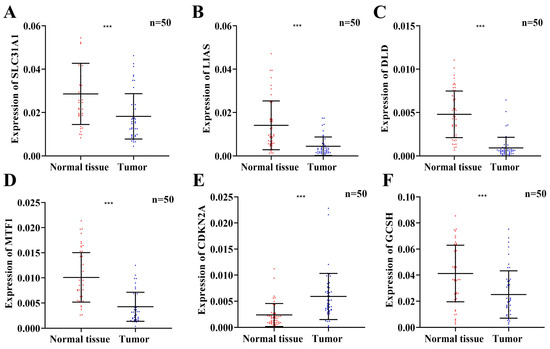 The relative expression levels of SLC31A1 (A), LIAS (B), DLD (C), MTF1 (D), CDKN2A (E), and GCSH (F) in 50 pairs of tissue samples from PTC patients by qRT-PCR. (*** p < 0.001).