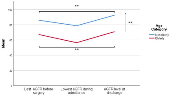 The Course of eGFR Level from Admission to Discharge. ** Significant at the p < 0.001 level.